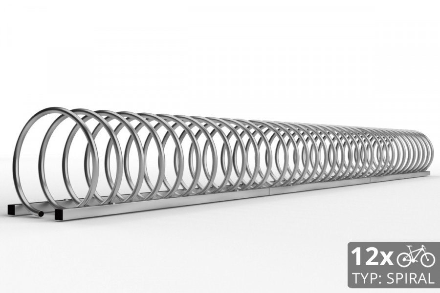 Horganyzott SPIRAL kerékpártartó 12 kerékpárhoz, 330 cm hosszú, ideális megoldás kerékpárok tárolására.
