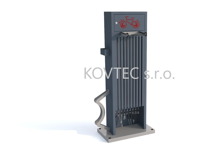 Samoobslužný servisný cyklostojan na opravu bicyklov s náradím a s mini pumpou.