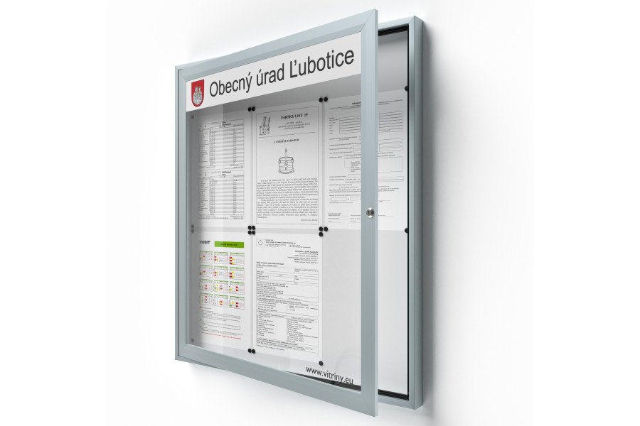 Ha részletesen meg kell jelölnie az információs vitrint címerrel vagy szöveggel, a 80 mm magas integrált terület jól elrejthető a vitrin belsejében a vandálok elől. A vitrin jelölésére szolgáló terület nem csökkenti a kihelyezett információs területet, és nem fedi át az információs vitrinben elhelyezett információs közleményeket !