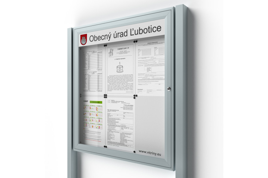 Ha részletesen meg kell jelölnie az információs vitrint címerrel vagy szöveggel, a 80 mm magas integrált terület jól elrejthető a vitrin belsejében a vandálok elől. A vitrin jelölésére szolgáló terület nem csökkenti a kihelyezett információs területet, és nem fedi át az információs vitrinben elhelyezett információs közleményeket !